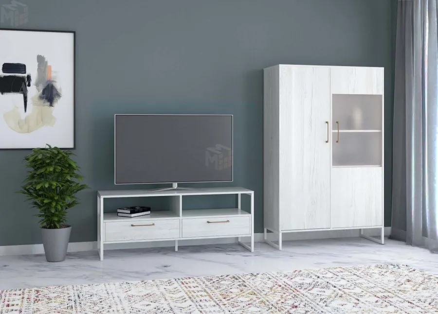 Шкаф имеет универсальную сборку и вставку из белого матового стекла. Внутри него находится десять больших полок.