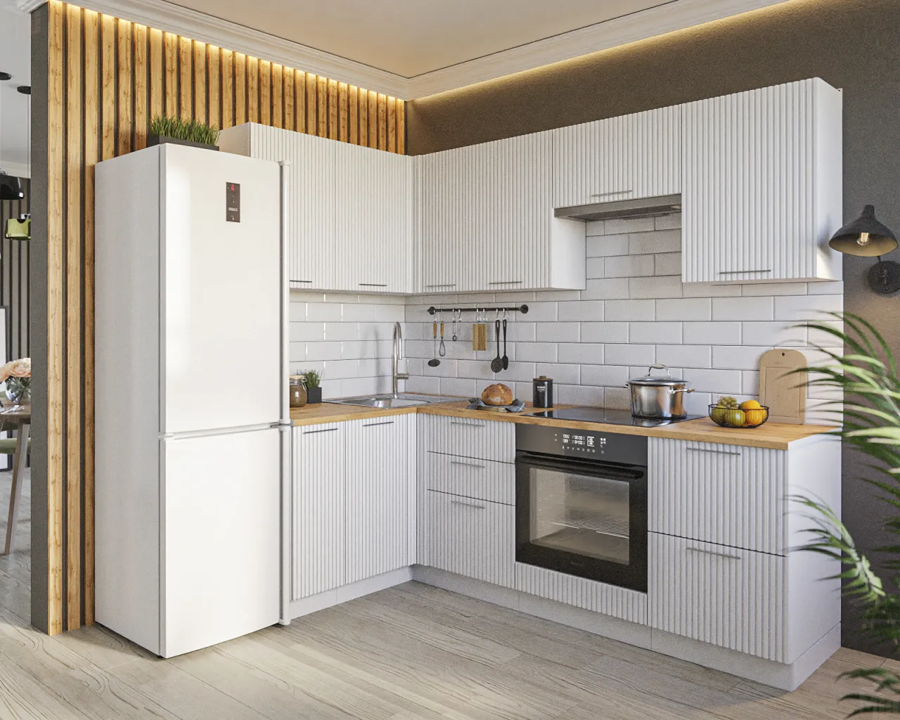 Универсальная сборка позволяет собирать кухонный гарнитур «Солара» как конструктор. Секции легко перемещаются. Выбирайте правостороннюю или левостороннюю сборку, расставляйте секции по разным углам кухни или располагайте максимально компактно.Кухонный гарнитур «Солара» включает в себя верхние и нижние шкафы.Сверху кухонный гарнитур «Солара» разделен на четыре секции. Три секции с широкими полочками и один небольшой шкаф под вытяжку.Снизу Солара также разделена на четыре секций. Одна секция представлена широким шкафом. Две секции с выдвижными ящиками для комфортного доступа к кухонным приборам и ниша под варочную поверхность с выдвижным ящиком под духовкой.Шариковые направляющие обеспечивают надежность и бесшумность выдвижного механизма и позволяют ящикам выдерживать нагрузку в 30-60 кг.Каркас и фасад кухонного гарнитура «Солара» выполнены из прочных материалов. Покрытие не получится поцарапать, например, задев стулом. Столешница не деформируется от длительного контакта с водой или химическими средствами, а также устойчива к механическим повреждениям.