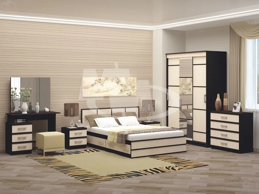 - кровать 1,4 (длина 2037 мм, ширина 1530 мм, высота 800 мм) или кровать 1,6 (длина 2037 мм, ширина 1730 мм, высота 800 мм). Основание спального места - настил ЛДСП. Матрас не входит в стоимость.