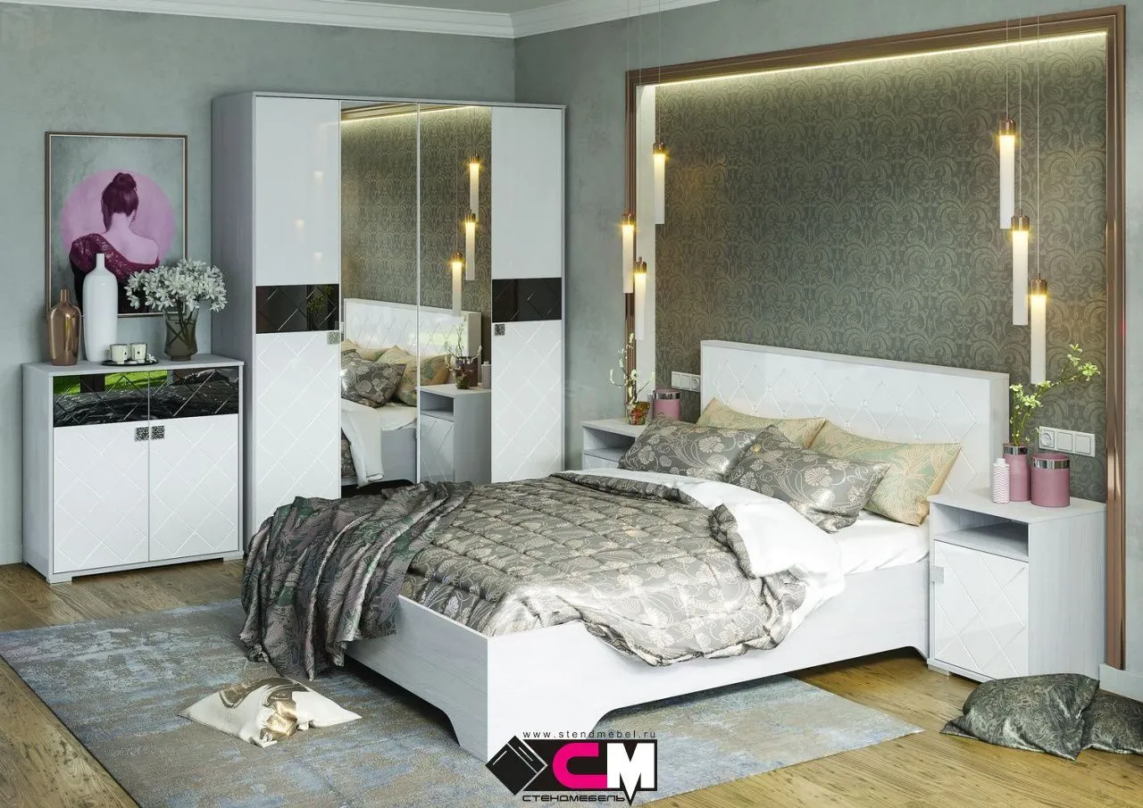 Спальня Сальма (вариант 1) поможет обустроить уютную комнату, где вы сможете отдохнуть не только телом, но и душой. За двумя центральными дверьми шкафа с зеркалами находится широкая штанга для вешалок-плечиков с верхней одеждой, деловыми костюмами, красивыми платьями и другой одеждой. Полки, скрытые за боковыми дверьми, пригодятся для сложенной одежды, постельного и нижнего белья, разнообразных аксессуаров и коробок с обувью. Прикроватные тумбы позволят хранить около кровати все необходимые предметы. Сверху на тумбе можно разместить небольшой светильник, памятная фотография и часы для своевременных подъемов. Кровать предоставит необычайно удобное спальное место, где вы после трудных и насыщенных дней сможете расслабиться, отдохнуть и набраться сил. Высокое изголовье позволит комфортно расположиться перед сном и почитать интересную книгу или посмотреть сериал на планшете. -
