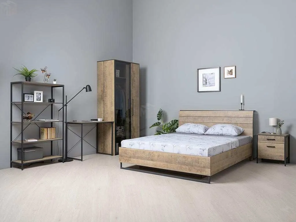 Спальня Трувор (вариант 2) выполнена в стиле хай-тек с комбинированием металла, ЛДСП и стекла. Шкаф двухстворчатый со стеклянной дверью для размещения верхней одежды - неординарное современное решение. Кровать двуспальная в оригинальной конструкции с одной спинкой с поворотной панелью. Кровать комплектуется основанием, подъемным механизмом и ящиком для белья. Тумба прикроватная с 2-я выдвижными ящиками для хранения мелких и личных предметов. Стеллаж и стол для работы и хранения книг и документов.