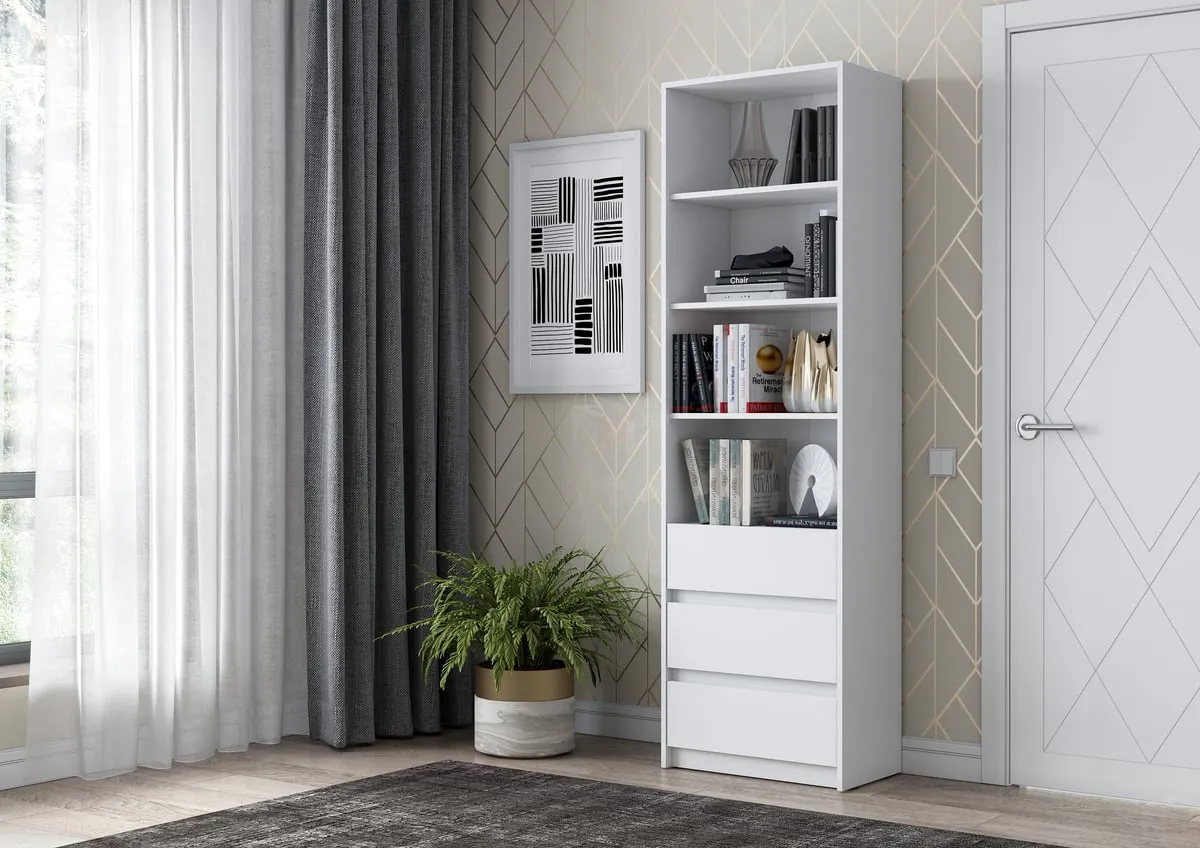 Стеллаж Айден с выдвижными ящиками – отличный вариант для небольшой комнаты или прихожей.