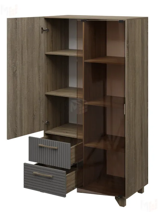 Стеллаж со стеклом Копенгаген — это практичное и дизайнерское решение для гостиной. Стеллаж имеет семь полок и два ящика. Ящики оснащены шариковыми направляющими полного выдвижения. Створки выполнены из ЛДСП и стекла, что позволяет хранить как необходимые предметы, так и предметы декора. Створки крепятся на петли с доводчиками для плавности хода. Конструкцией предусмотрен механизм открывания створок «push-to-open». Ручки ящиков из натурального массива дуба. Опоры изделия выполнены из массива дерева и имеют регулировку по высоте. Сочетание расцветки фасадов ящика и корпуса модели поможет подобрать идеальный вариант к обстановке помещения. -