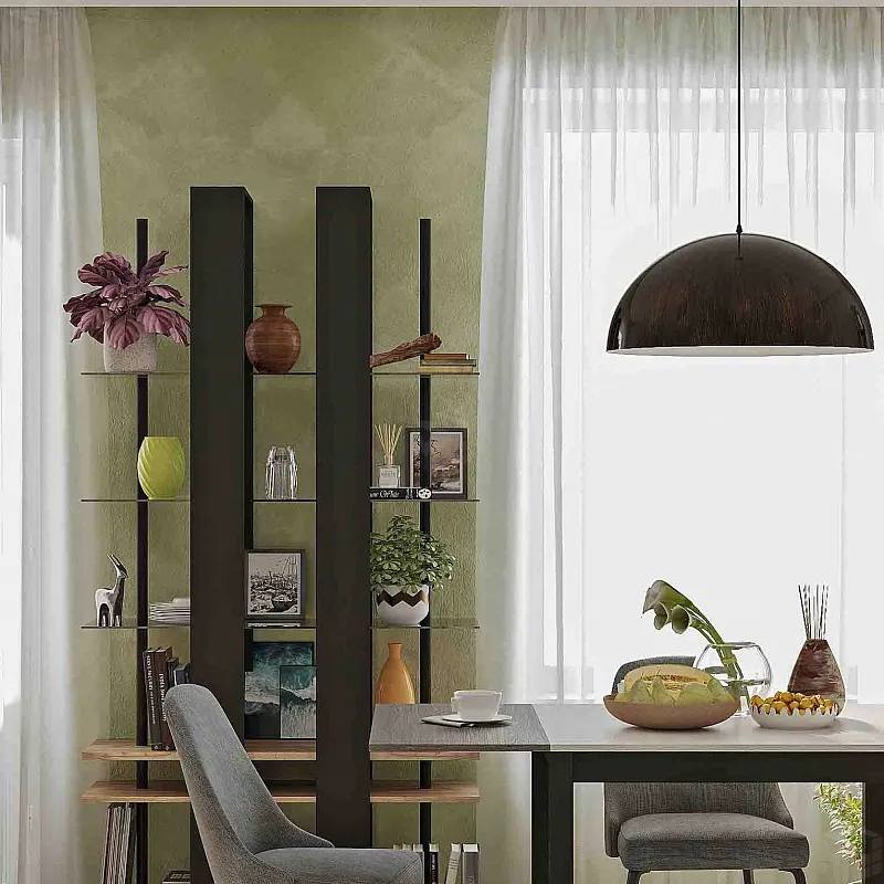 Изящный и стильный стеллаж с открытыми полками не займёт много свободного места, но станет значимой интерьерной деталью гостиной. Комбинация стеклянных полок и элементов «под дерево» выглядит стильно и очень достойно. Благодаря невидимым глазу креплениям создается впечатление, что стеклянные полки зависли в воздухе. Но несмотря на кажущуюся легкость и воздушность, тонированное стекло (бронза) выдерживает нагрузку до 5 кг, что позволит разместить на стеллаже любимые книги, диски, комнатные растения или предметы декора.