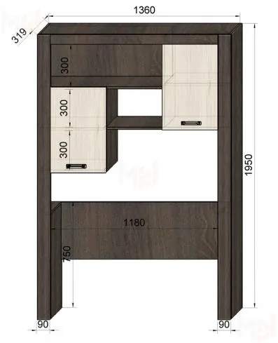 Ширина 1360 мм, Глубина 319 мм, Высота 1950 мм