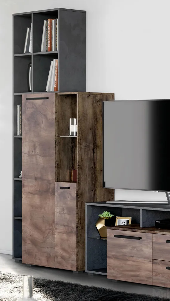 Стеллаж разработан как приставной элемент угловой формы и может использоваться только совместно с Двухдверной тумбой из набора для гостиной Глазго.