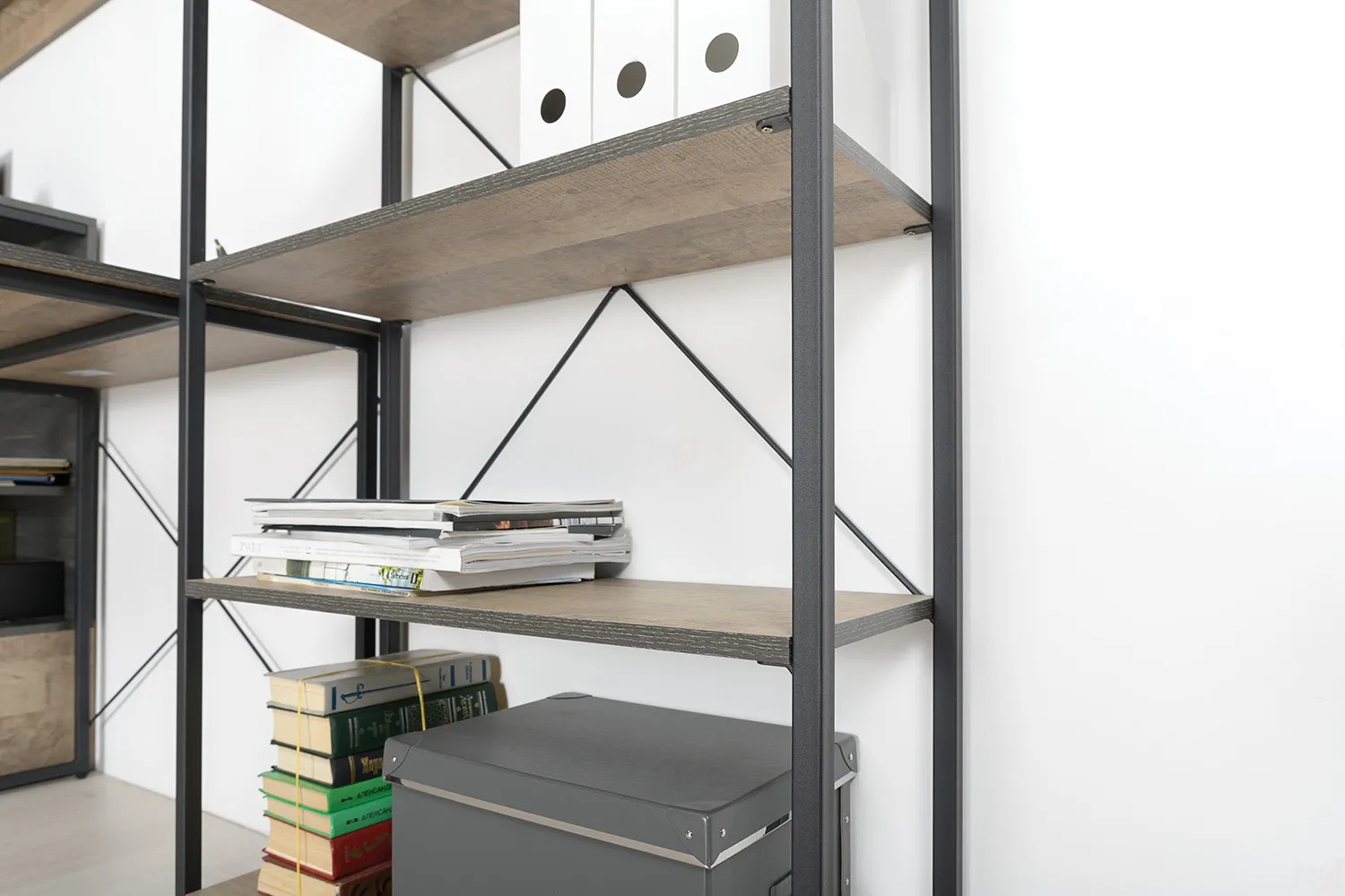 Стеллаж Трувор 13.151.01 прекрасно впишется в интерьер вашей комнаты. Открытые полки созданы для хранения познавательных книг, папок с документами и других необходимых вещей. Стеллаж является надежным благодаря металлическим стойкам с регулируемыми опорами. Использование крестовых металлических стяжек вместо задней стенки делает конструкции лёгкими, воздушными и чрезвычайно прочными к боковым нагрузкам.