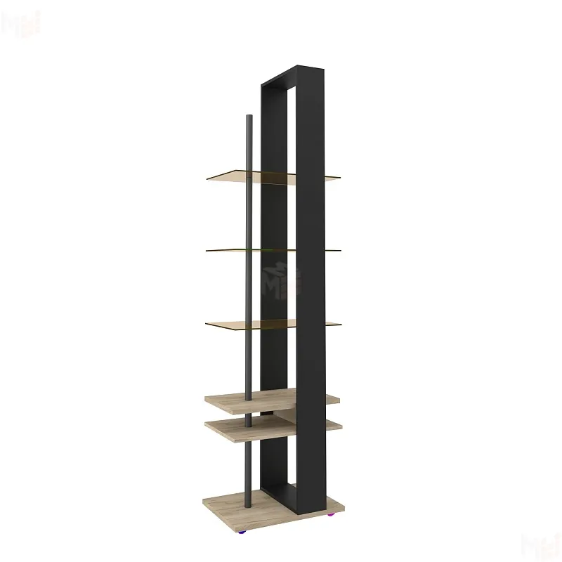 Открытый стеллаж– это многофункциональный предмет мебели, который используют не только для хранения вещей. С его помощью зонируют и декорируют помещение. Сочетание открытых стеклянных полок и открытых полок из ЛДСП позволяет не загромождать пространство в комнате. Рациональное распределение нагрузки на конструкцию – важный момент в проектировании стеллажа, тонированное стекло (bronz) выдерживает нагрузку до 5 кг. Цветы, фото и аксессуары на полках подчеркнут индивидуальность хозяина дома и станут отличным дополнением интерьера.Регулируемые опоры