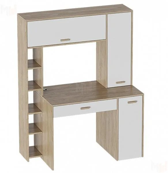 Внутреннее пространство стола разделено на три закрытых зоны: правая зона оснащена одной съемной и тремя жесткими полками. Левая зона представлена в виде открытой ниши с полками. Верхнее отделение разделено на две части перегородкой. Под столешницей расположен ящик на шариковых направляющих. -