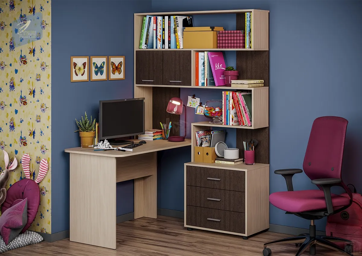 Уголок состоит из рабочего стола размером Д.1300 х В.750 х Г.640 мм. и расположенной под прямым углом к столу тумбой с 3мя выдвижными ящиками размером Д.640 х В.594 х Г.397 мм. А над всем этим располагается вместительная надстройка с открытыми полками и закрытой нишей.