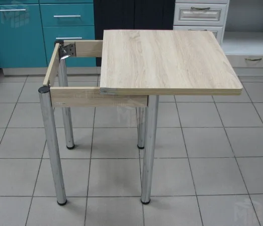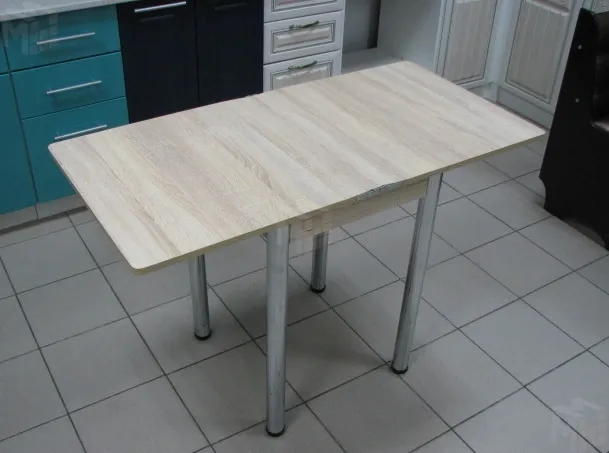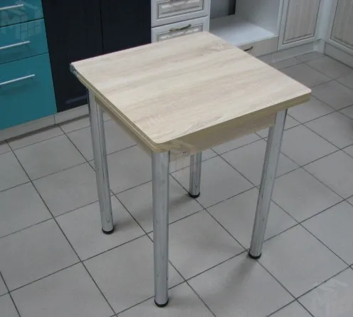 Стол на металлических хромированных ножках. Столешница ЛДСП, цвет дуб сонома. Размер столешницы 580*580 мм, в разложенном виде 580*1160 мм.