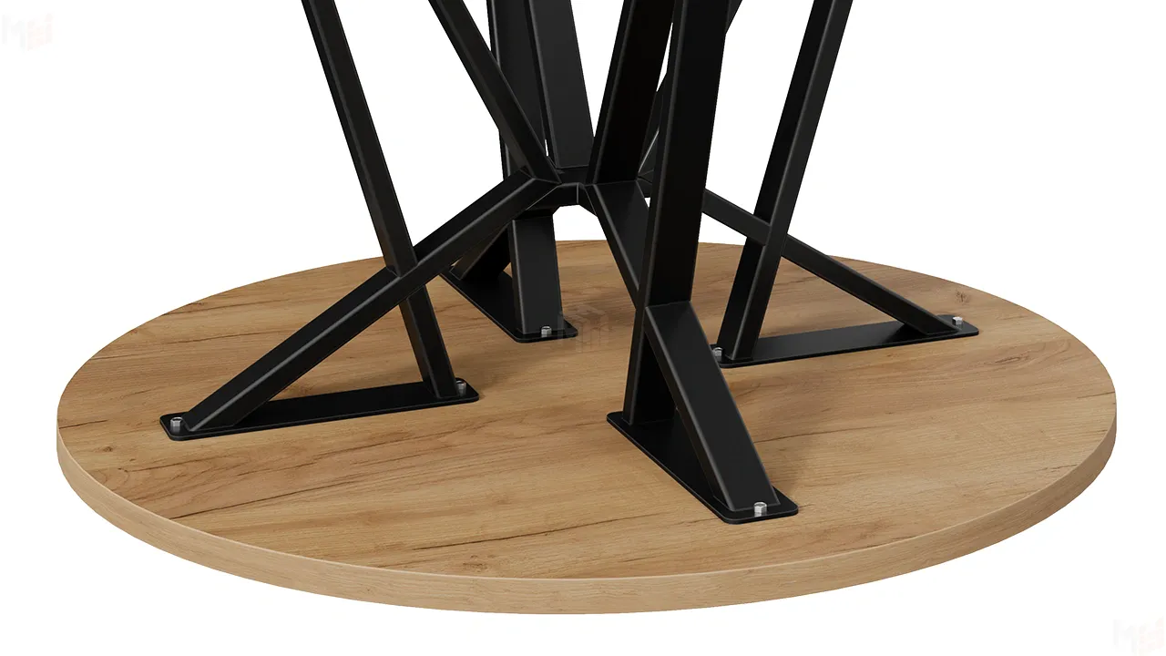 Столешница круглой формы изготовлена из ЛДСП 22 мм с обработкой торцов кромкой ABS 2 мм. Опора нестандартной формы выполнена из металла.