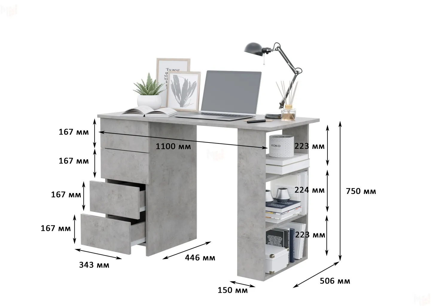 Стол выполнен из ЛДСП цвета бетон толщиной 16 мм.