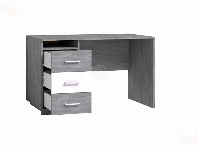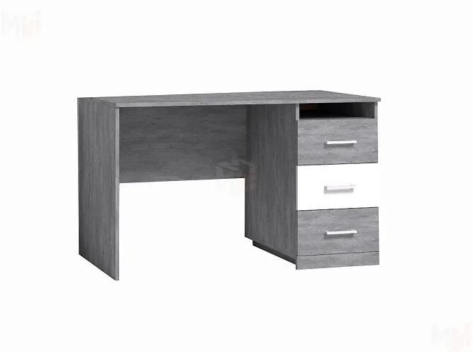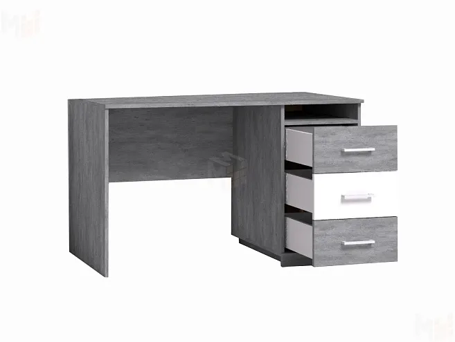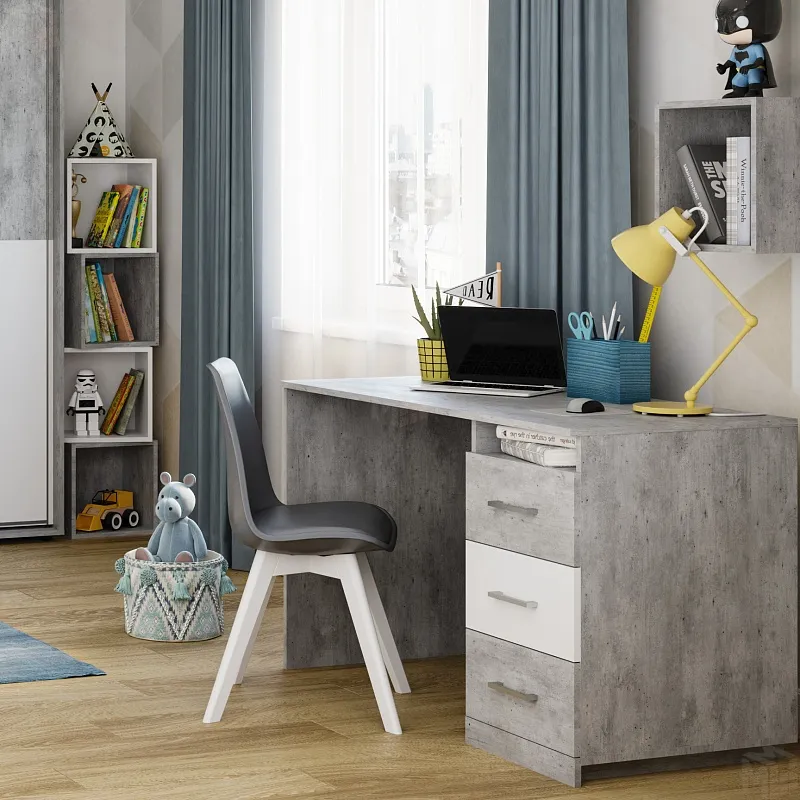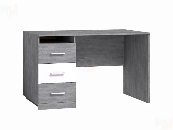 Один ящичный фасад белого цвета, а два других в декоре Atelier светлый под бетон. За счет просторной рабочей поверхности, а также возможности левосторонней и правосторонней сборки 84 Стол письменный одинаково удобен как для левши, так и для правши.