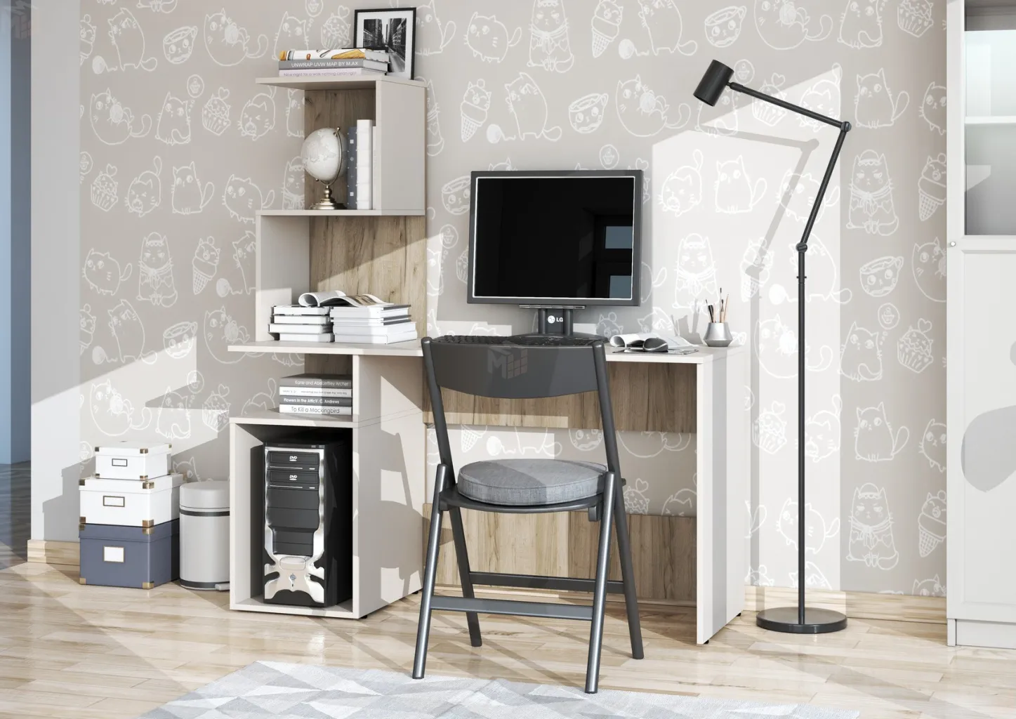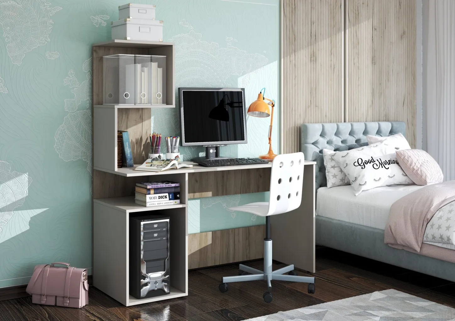 Блок с полками. Состоит из одного щита, на который крепится блок из полок и открытой ниши под столешницей письменного стола.