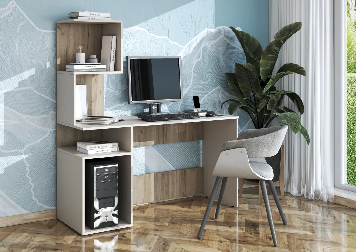 Задняя часть письменного стола под столешницей имеет две вязки размером Д.953хВ.234мм, обеспечивающие жесткость конструкции. Цвет — ЛДСП - Дуб Крафт серый.