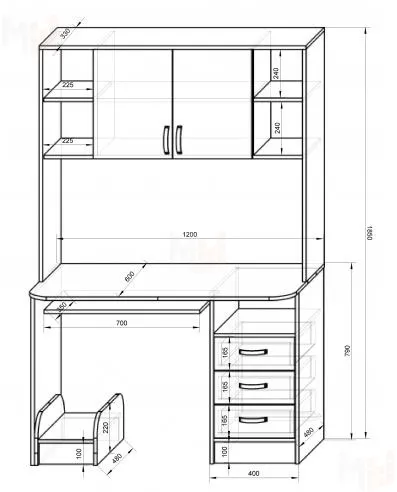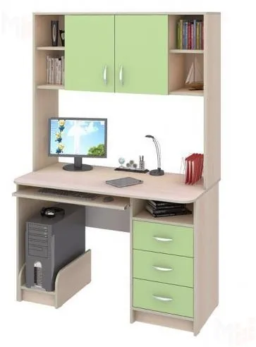 Конструкция представляет собой письменный стол с выкатной полкой под клавиатуру и встроенной тумбой, а также надстройку с полками и закрытыми ящичками для книг и тетрадей, игрушек и детских вещей.