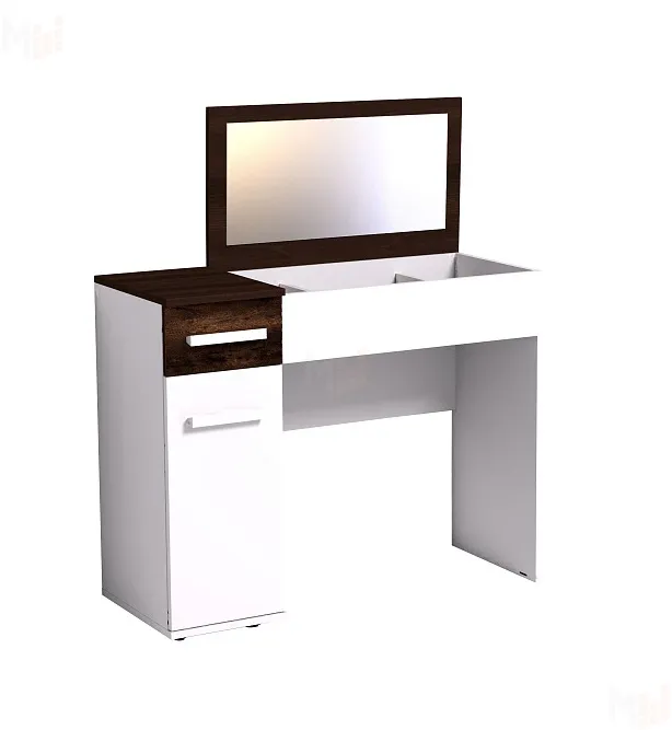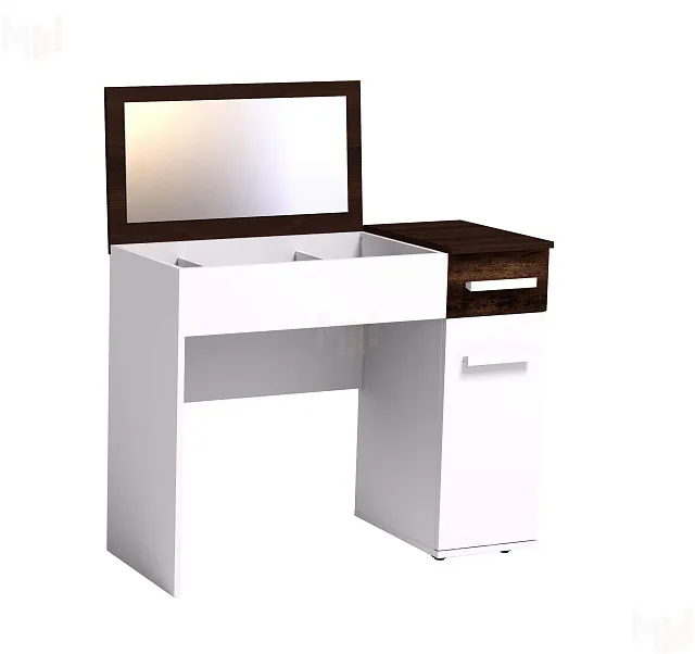 Простой с виду туалетный столик из коллекции Норвуд обладает интересной конструкцией. Откидная контрастная крышка стола скрывает нишу с органайзером для хранения мелких аксессуаров. На внутренней стороне крышки - зеркало, перед которым удобно наносить макияж и проводить косметические процедуры.