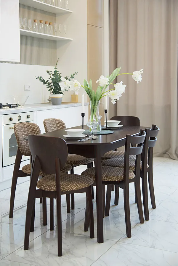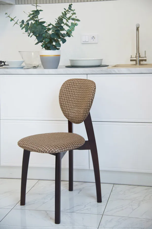 Каркас стула выполнен из массива дерева. Сиденье покрыто мягким слоем наполнителя и обшито текстилем, удобная спинка необычной круглой формы.