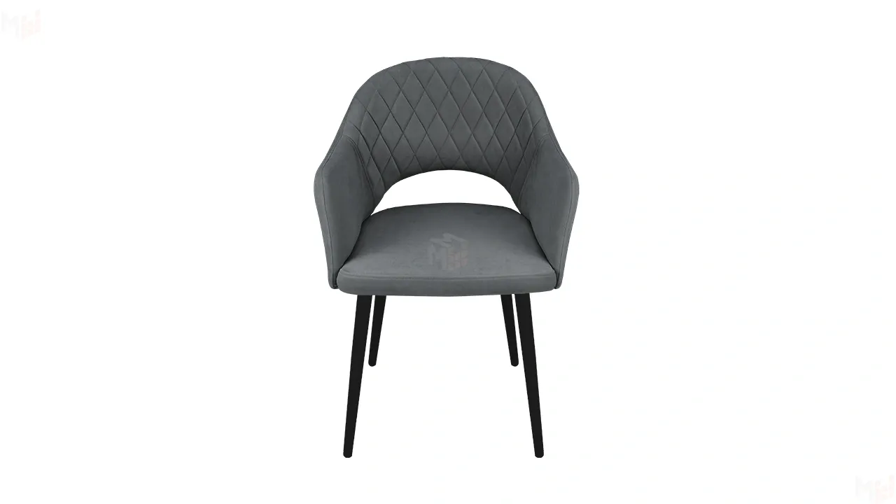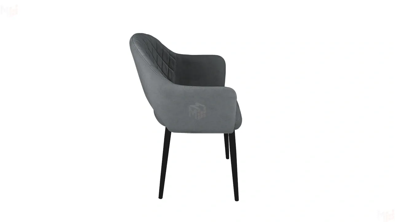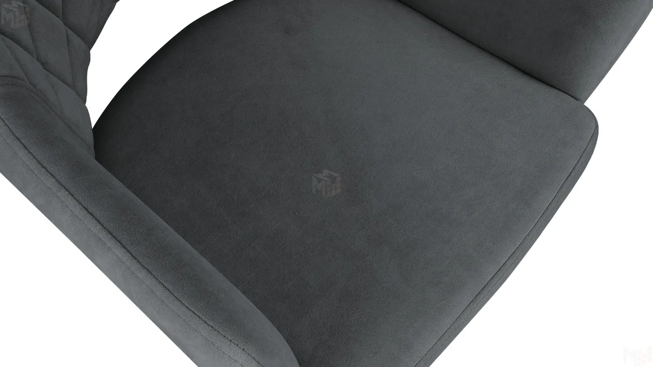 Модель с сиденьем и спинкой, плавно переходящей в подлокотники, дополнена велюровой обивкой со стежкой в форме небольших ромбов
