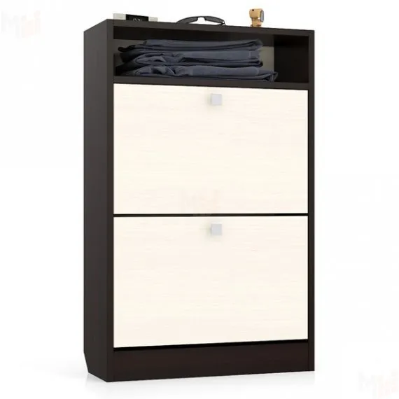 Удобная и вместительная тумба для обуви с двумя отделениями с откидными дверцами и открытой полочкой сверху.