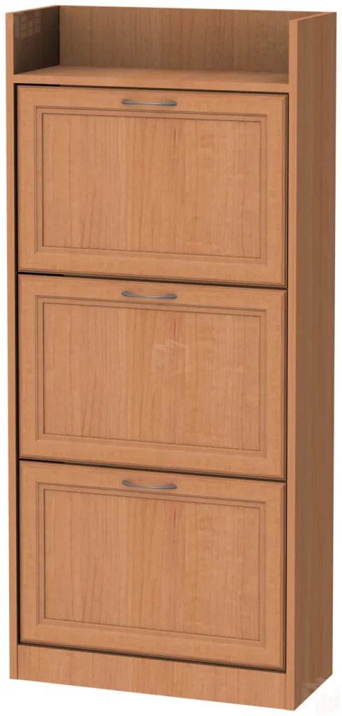 Обувница имеет три отделения с откидывающимися дверцами. Внутри каждое из отделений разделено еще на два, при помощи дополнительной полочки.