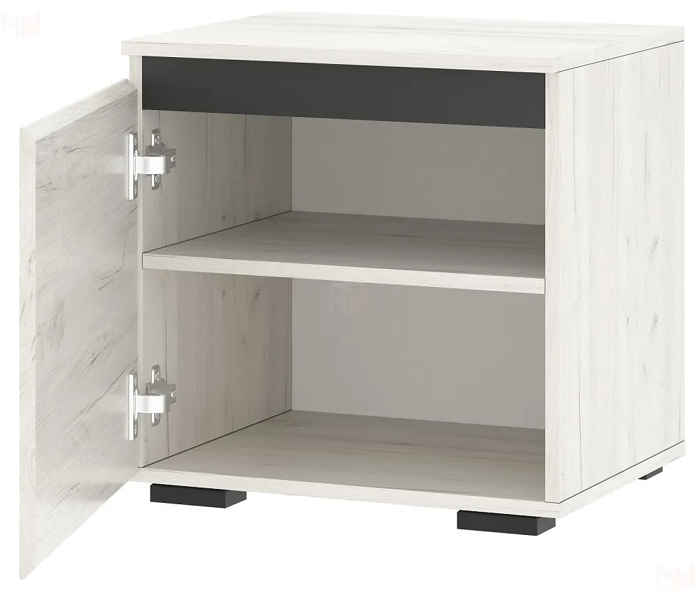 Тумба 500 "ГРЕТТА" с распашным фасадом и полкой. Применение интегрированной ручки на фасадах делает модель стильной и безопасной – дверцы и ящик открываются за профилированные выступы. Фасады обработаны кромкой 1 мм. Чёрная регулируемая ножка-опора.