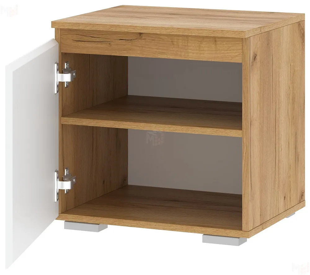 Тумба 500 "ГРЕТТА" с распашным фасадом и полкой. Применение интегрированной ручки на фасадах делает модель стильной и безопасной – дверцы и ящик открываются за профилированные выступы. Фасады обработаны кромкой 1 мм. Чёрная регулируемая ножка-опора.