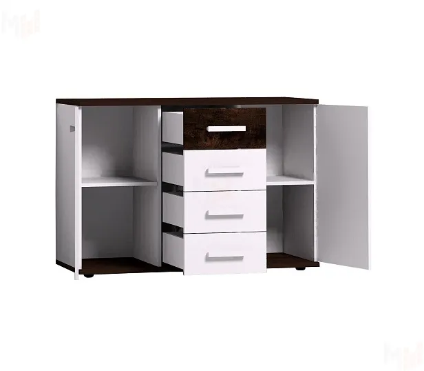 Стильная Норвуд 5 Тумба МЦН отвечает требованиям скандинавского стиля. Яркие акценты тумбы - контрастные горизонтальные детали толщиной 22 мм и фасад верхнего ящика в декоре Орех Шоколадный. Четыре выдвижных ящика на шариковых направляющих, две распашные дверцы по бокам легко и удобно открываются за светлые ручки из массива. Регулируемые опоры компенсируют неровности пола.