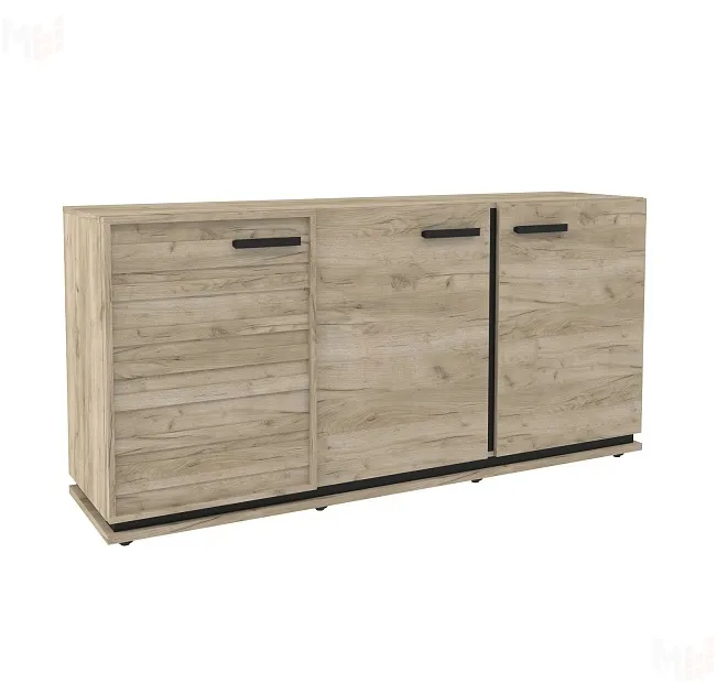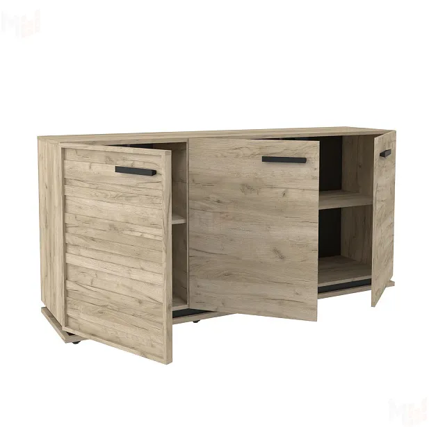 Тумба МЦН – функциональный модуль, который подходит не только для хранения вещей, но и для размещения телевизора. Тумба из трех отделений, за распашными дверцами которых полки, регулируемые по высоте. Изюминку тумбе придает необычный фасад в массивной раме и с раскладкой. Контрастные темные ручки из массива дерева подчеркивают цвет и текстуру натурального дерева. Регулируемые опоры компенсируют незначительные неровности пола.