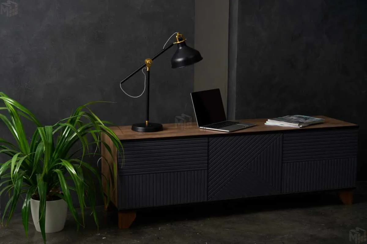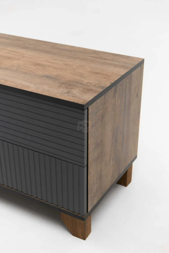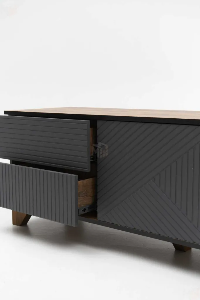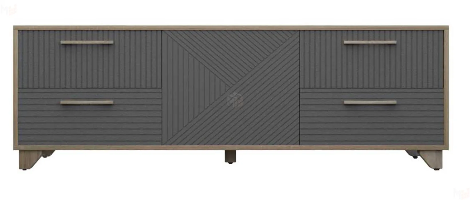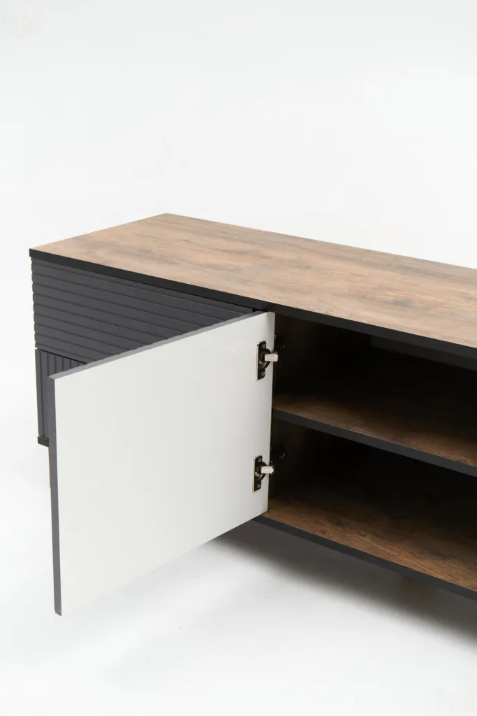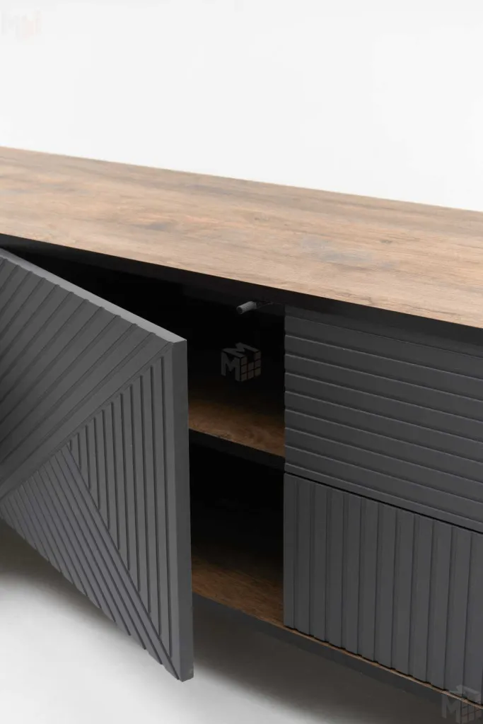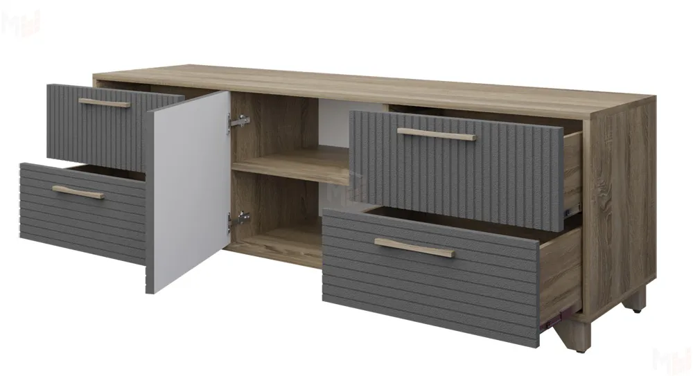 Тумба под ТВ предназначена для размещения телевизора, медиа-техники, личных вещей, предметов декора, поэтому имеет важное значение для гостиной. Данная модель оснащена боковыми выдвижными ящиками на шариковых направляющих полного выдвижения. Между ящиками располагается ниша с двумя полками, закрытая створкой. Для плавности хода створка закреплена на петли с доводчиками. В конструкции тумбы предусмотрен механизм открывания ящиков и створки «push-to-open». Фасад выдвижных ящиков оснащен ручками из массива дуба. Ножки изделия изготовлены из массива дерева и имеют регулировку по высоте. Возможно комбинирование расцветок корпуса и фасада. -