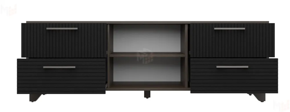 Тумба под ТВ — это необходимый предмет мебели для гостиной. Она занимает центральное место и выполняет важную функцию: размещение телевизора, ТВ-аксессуаров, личных вещей. Данная модель оснащена боковыми выдвижными ящиками на шариковых направляющих полного выдвижения. Ящики укомплектованы ручками из натурального дуба. Между ящиками располагается открытая ниша с двумя полками. Ножки изделия выполнены из массива дерева и имеют регулировку по высоте. Для подбора изделия под интерьер, возможна комбинация сочетания цветов корпуса и фасада. -