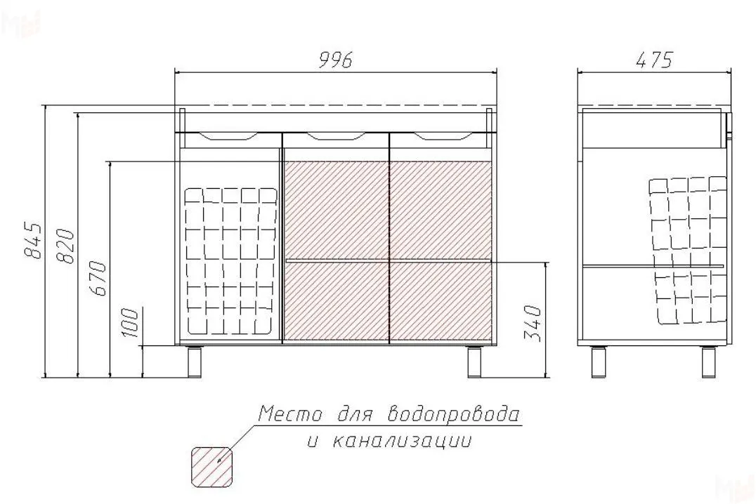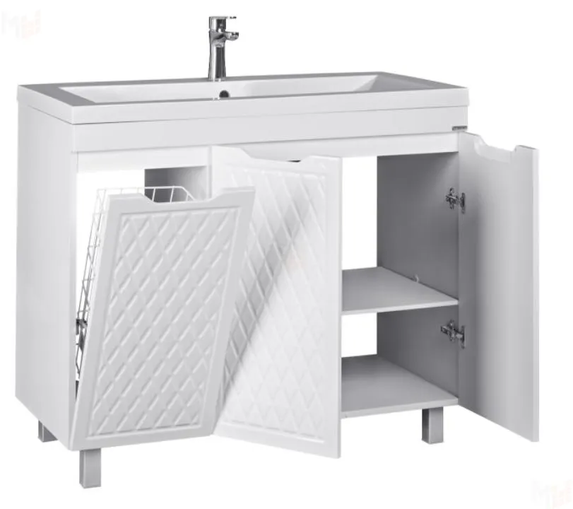 Тумба под умывальник 3D ANDREA100 имеет два отсека: один большой (две дверцы, полка посередине), второй – поменьше (отсек с корзиной для белья).