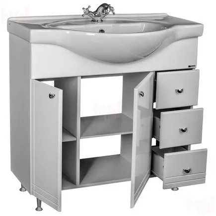 Под умывальник "Сенеж 87 Классик" (в комплект не входит). Габариты изделия указаны без учёта габаритов ножек, умывальника, упаковки и ручек. Поставляется в собранном виде. Фурнитура производства Германии. Фасады покрыты высокоглянцевой эмалью производства Италии.