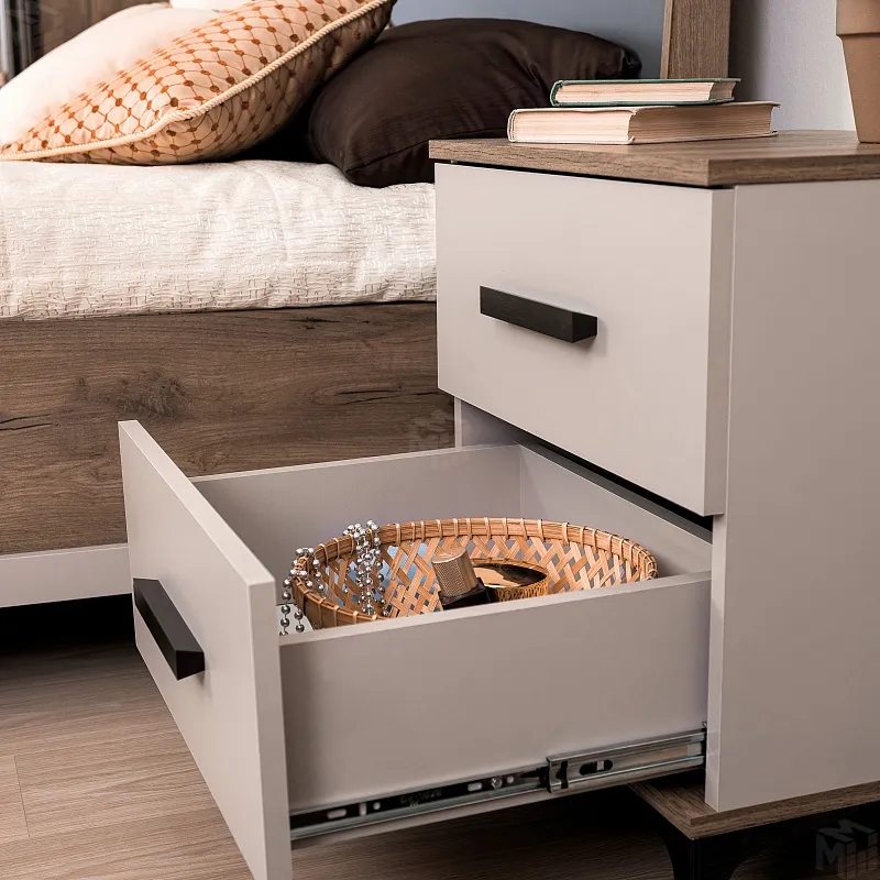 Низ и столешница тумбы выполнены из контрастной плиты ЛДСП Дуб Табачный. Выдвижные ящики оснащены шариковыми направляющими полного выдвижения, что предполагает их удобную и простую установку при сборке. Фигурные металлические опоры приподнимают тумбу и придают ей изысканный силуэт.
