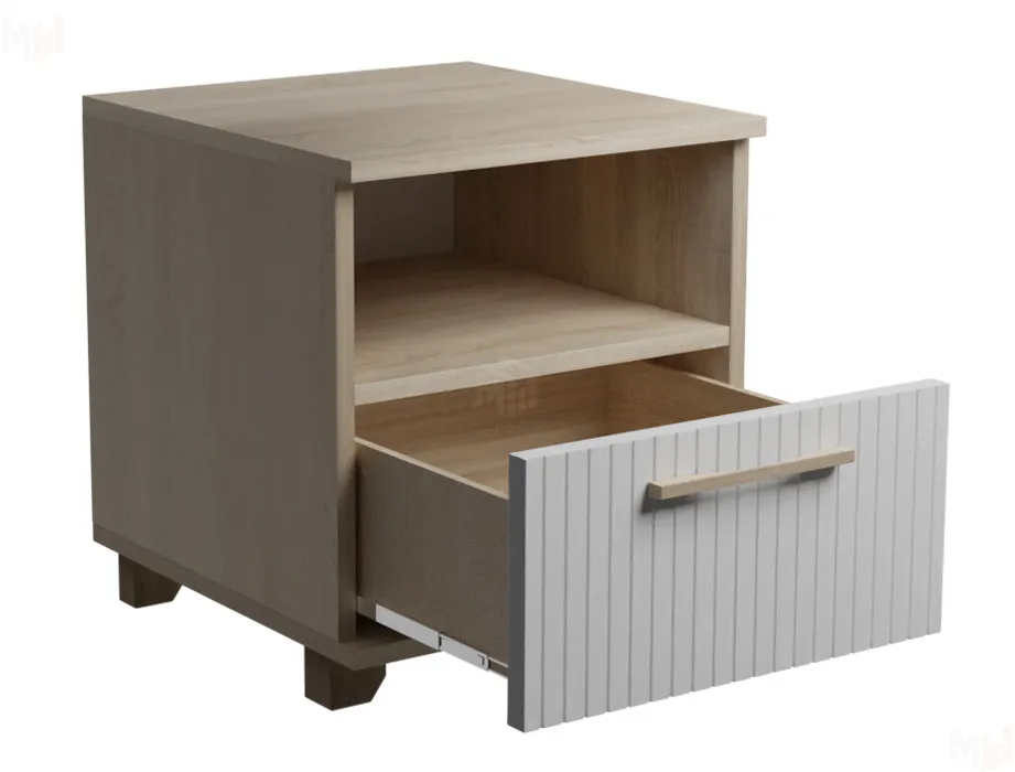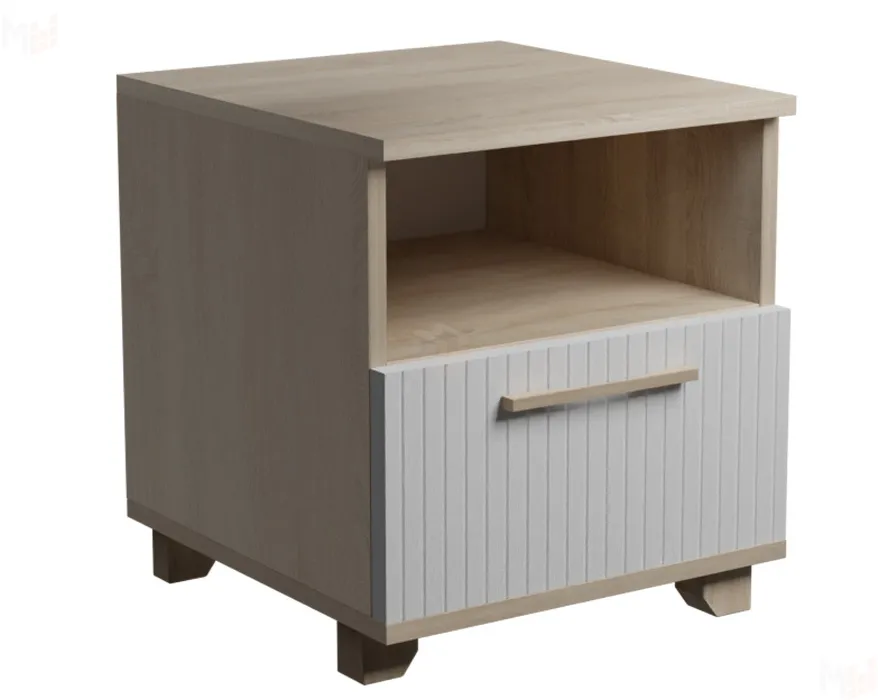 Незаменимый предмет мебели в спальной — это прикроватная тумба. Она позволит удобно и практично расположить предметы и личные вещи, необходимые перед сном и во время отдыха. Данная модель тумбы оснащена открытой нишей и выдвижным ящиком. Ящик оборудован шариковыми направляющими полного выдвижения. Удобство использования дополняет деревянная ручка из массива дуба. Регулируемые по высоте ножки выполнены из массива дерева. Выбрать нужное изделие поможет комбинирование цветов фасада ящика и корпуса. -
