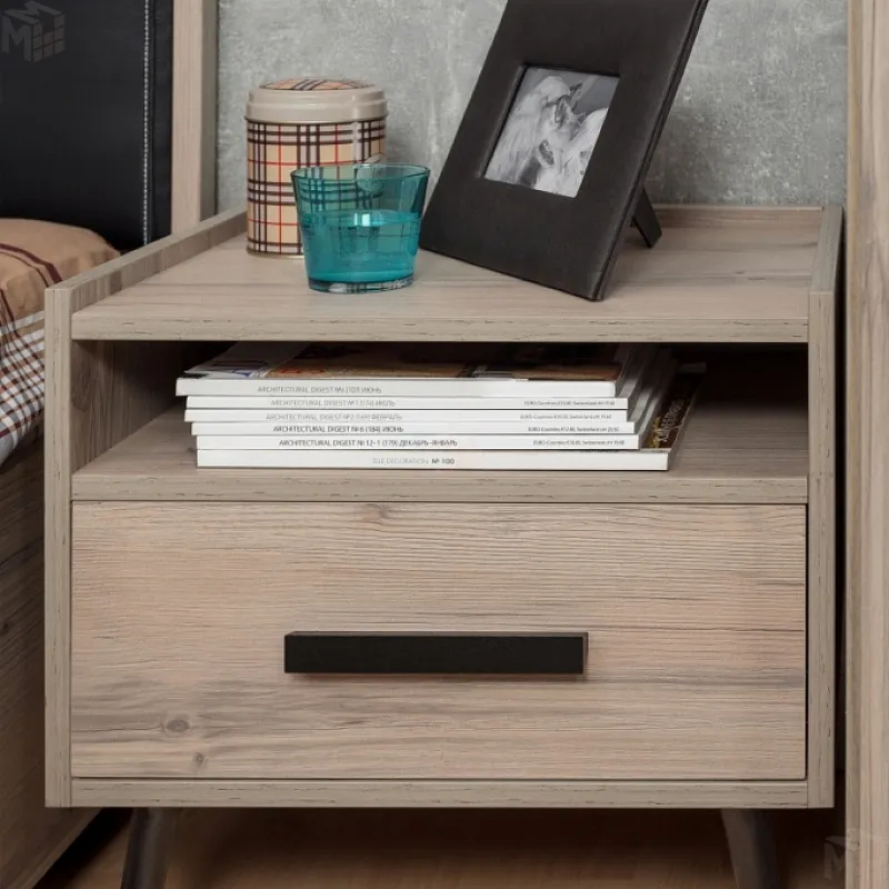 Элегантная и легкая тумба прикроватная 41 с 1-им выдвижным ящиком станет прекрасным дополнением к кровати коллекции Nature. Аккуратные черные опоры и ручки тумбы прикроватной выполнены из массива дерева. Они подчеркнут естественную красоту древесного декора и добавят мебели роскоши и «характера».