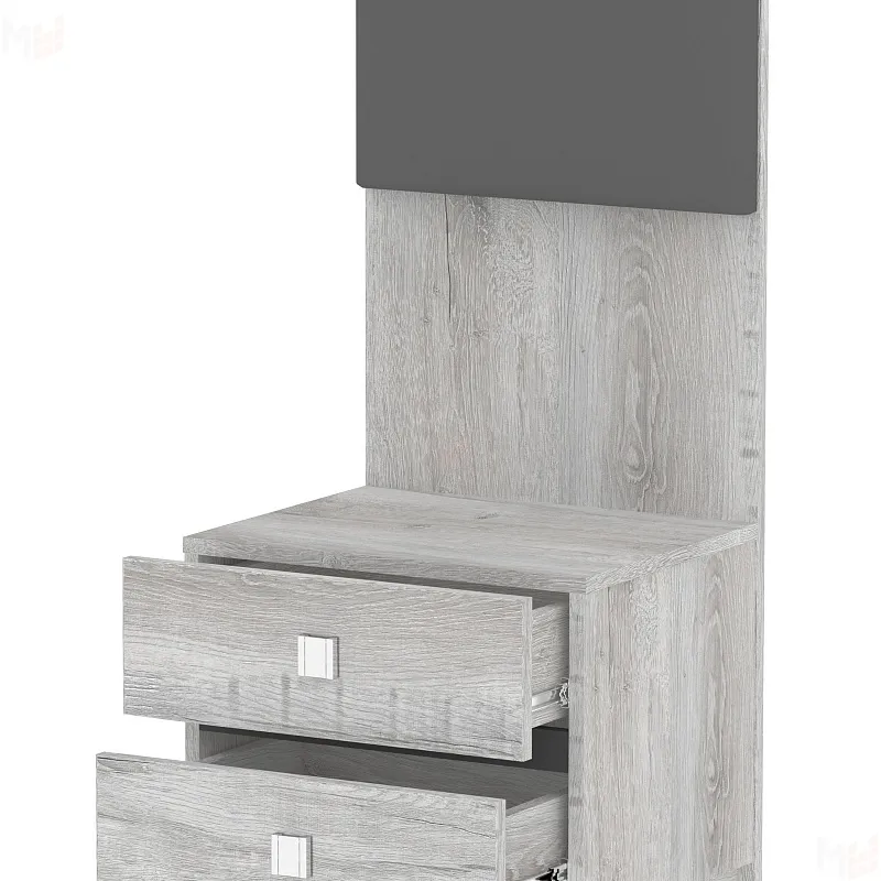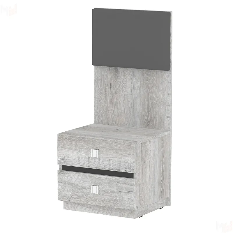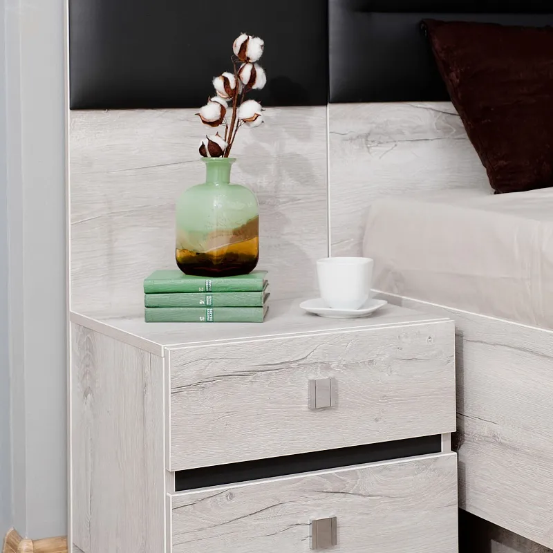 Прикроватная тумба NEO 41 с двумя выдвижными ящиками и высокой мягкой спинкой – красивый и функциональный модуль. Изюминка тумбы - комбинированная задняя стенка, возвышающаяся над столешницей: ее нижняя часть из ЛДСП, а верхняя с подушечкой из экокожи черного цвета. Когда тумба приставлена к кровати, тогда она составляет единую композицию с изголовьем. Дополняют тумбу интересные ручки на ящиках: в обычном состоянии - это плоские прямоугольные кнопки, а при необходимости выдвинуть ящик средняя часть приподнимается кончиками пальцев.