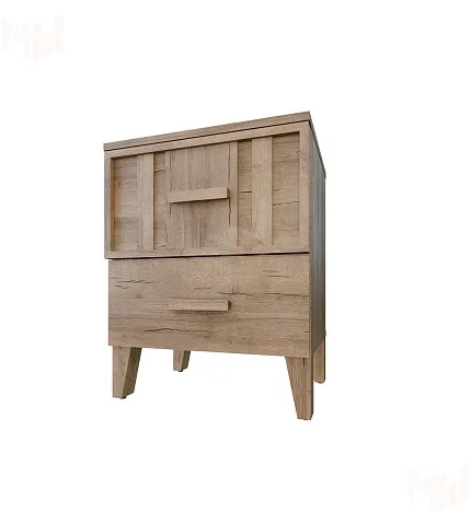 Тумба прикроватная 41 – необходимый предмет мебели в современной спальне, на который возлагаются функции классического прикроватного столика. Опоры со скосом – это не только дизайнерская находка, такое решение позволит без труда делать уборку в Вашей спальне. Два ящика глубиной 300 мм оснащены шариковыми направляющими полного выдвижения, что обеспечивает плавность и бесшумность хода. Рамочный фасад верхнего ящика украшен вертикальными планками разной ширины в цвет основного декора Дуб Серый и ручкой из массива дуба.