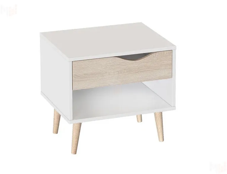 Тумба прикроватная Соната с непроходными боковыми стенками, между которыми в верхней части расположен ящик на шариковых направляющих, с фасадом, декорированным вырезной ручкой в цвете Дуб Сонома, а в нижней — открытая ниша для хранения.