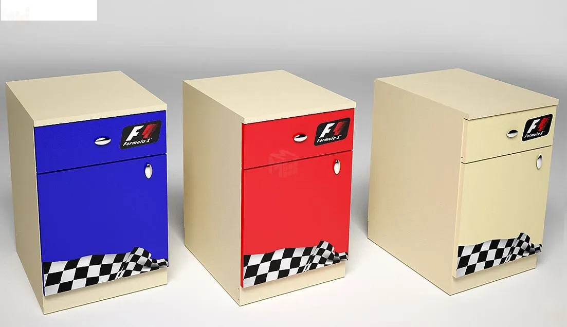 Мебель производится в цвете корпуса крем ваниль, а фасады могут быть крем ваниль, красного или синего оттенка. Фасадная часть декорирована принтом в стиле Формулы-1.