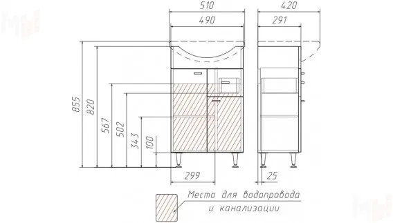 ширина 490 мм, глубина 291 мм, высота 820 мм