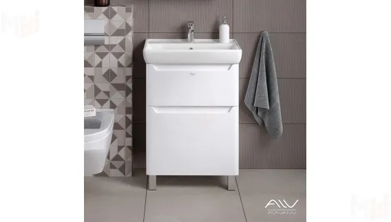 Белая тумба с раковиной Lana 60 с гладким фасадом и двумя выдвижными ящиками с декоративными зацепами является образцом современного дизайна, практичности и функциональности. Вместительные ящики из ДСП с применением фирменного материала Твист, с удобными доводчиками плавного закрывания, позволят разместить в них все необходимые принадлежности в ванной комнате.