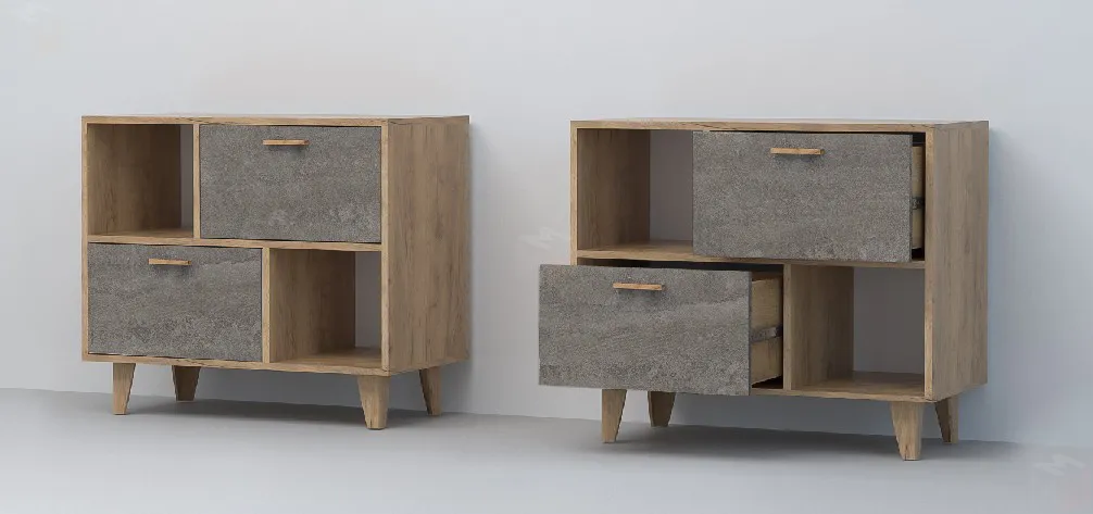 Тумба оснащена двумя ящиками на шариковых направляющих полного выдвижения и двумя открытыми нишами.