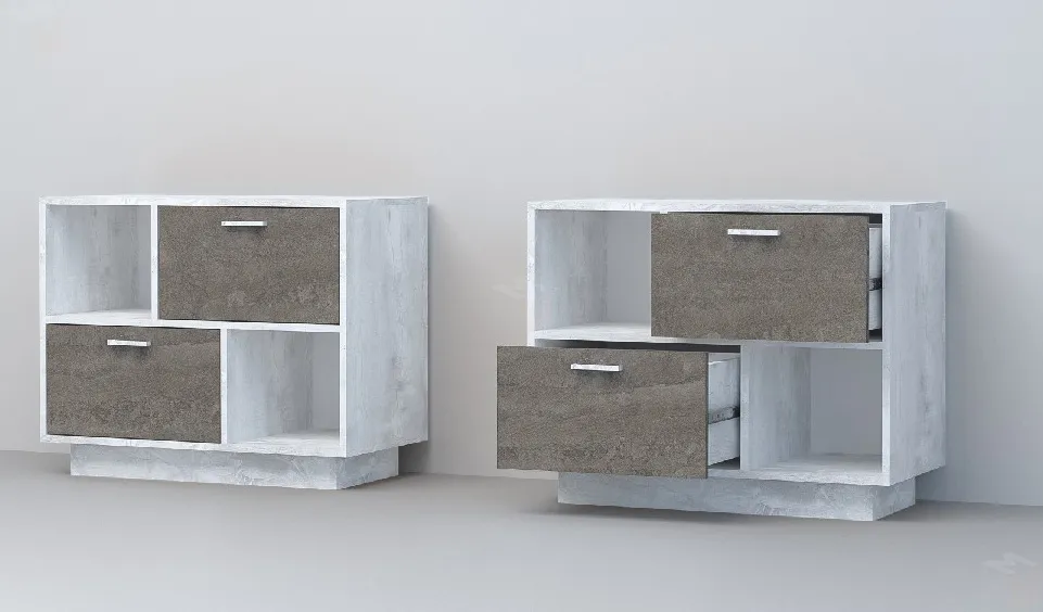Тумба оснащена двумя ящиками на шариковых направляющих полного выдвижения и двумя открытыми нишами.