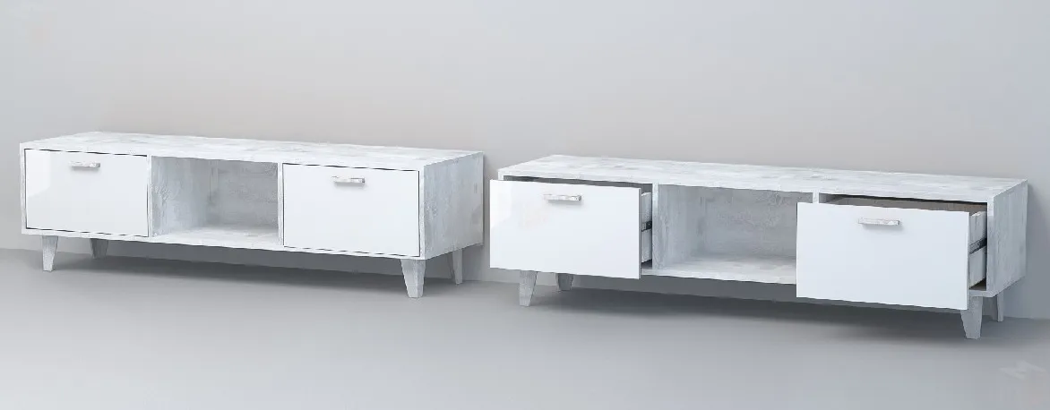 Тумба под аппаратуру оснащена двумя выдвижными ящиками на шариковых направляющих полного выдвижения и открытой нишей.