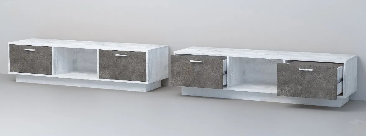Тумба под аппаратуру оснащена двумя выдвижными ящиками на шариковых направляющих полного выдвижения и открытой нишей.