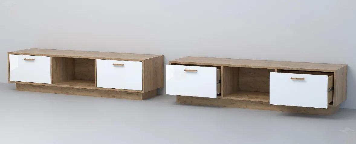 Тумба под аппаратуру оснащена двумя выдвижными ящиками на шариковых направляющих полного выдвижения и открытой нишей.