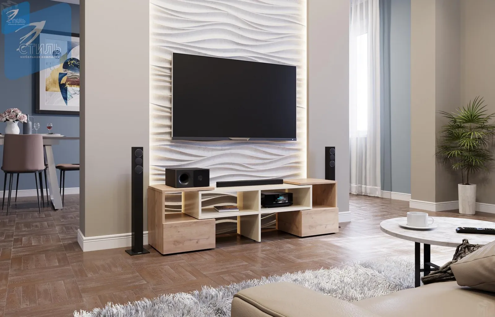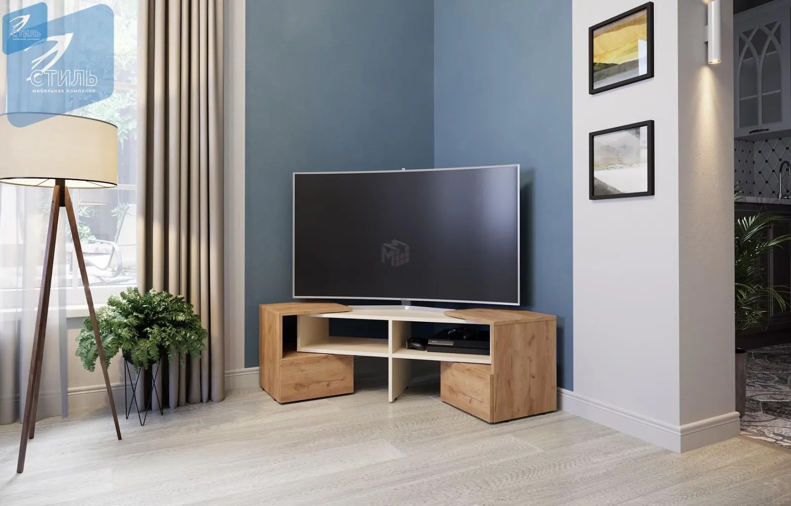 Главной особенностью Тумбы ТВ-9 является её адаптивная конструкция. Пользователь легко задает нужную форму по конфигурации помещения: прямую, с внутренним, внешним или сложным углом. Элементы тумбы (крепятся на специальных металлических шкантах) можно поворачивать относительно друг друга и задавать нужное положение длины тумбы (угол поворота от 0 до 100 градусов в обе стороны; в прямой постановке минимальная длина тумбы 1252 мм, максимальная - 1380 мм).