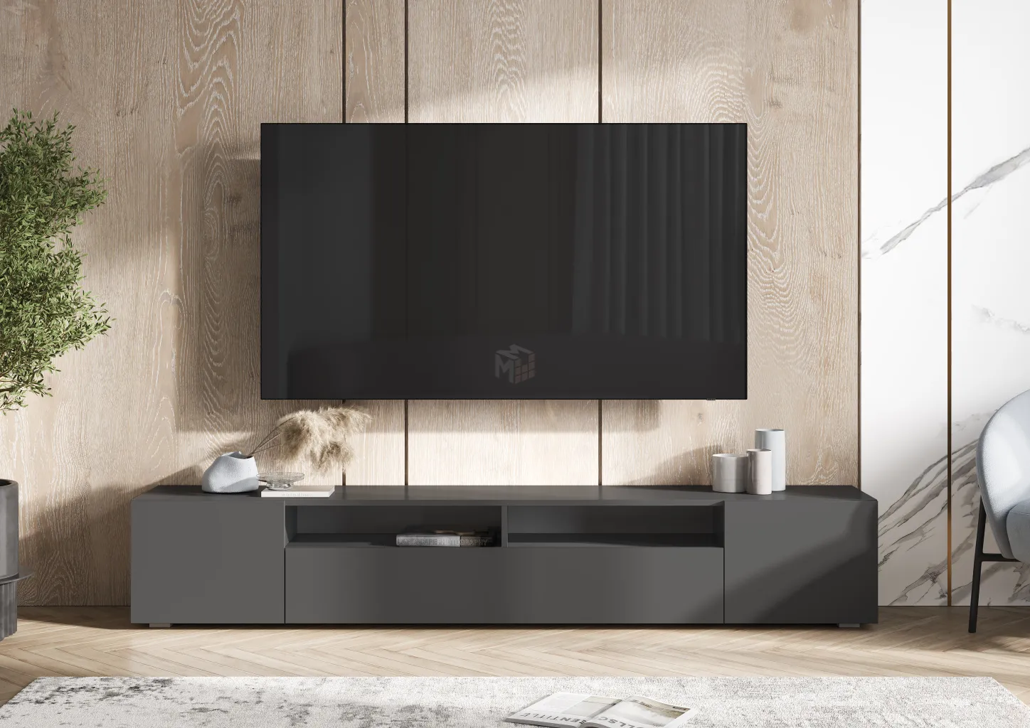 Тумба ТВ Глосс с опорами - СМ-319.03.011 Яблоня Беллуно, Cтекло Графит матовый